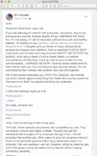 Here’s what Coomer had to say to his “friends” on Facebook on July 21, 2016, who are Trump supporters.