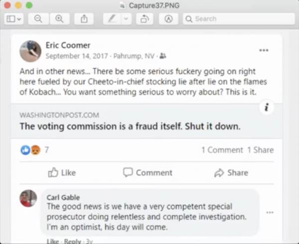 In 2017, when Coomer was in Nevada, he mocked President Trump’s Election Integrity Commission on Facebook.