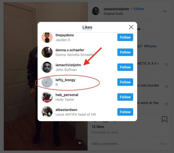 One of John’s Instagram friends, who goes by “lefty_boogy,” on Instagram and “liked” one of his posts, posted a call to fellow radicals notice on Instagram to rally them to DC on January 6 during Trump’s rally. He asked them to meet at the Black Lives Matter Plaza. The notification asks activists to bring “tactical gear, bulletproof vests–no firearms unless you are licensed. In his comment section “lefty_boogy” says, “Fight back. —Also if u can’t bring a gun I recommend knifes and pepper spray.