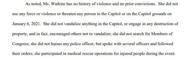 In the image above of court documents, Watkins allegedly committed no violence, harassment, or vandalism and encouraged others to do the same. She followed orders and “participated in medical rescue operations” during the event. Yet, she is charged with “conspiring to attack the Capital.