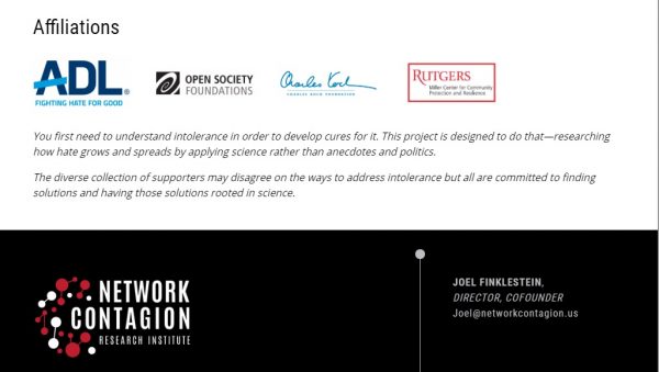 The Network Contagion Research Institute, headed by Joel Finkelstein, says on its website it’s affiliated with the Anti-Defamation League, George Soros’ Open Society Foundations and the Charles Koch Foundation — all of whom are lobbying for internet censorship.