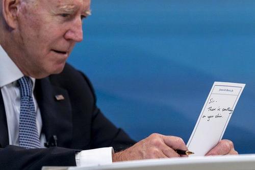 After the nosh, Biden not-so-subtly picked up the card, flipped it over, and inadvertently revealed the note to photographers covering the event.