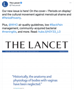 The exhibition review from which The Lancet cover quote was taken is a compelling call to empower women, together with non-binary, trans, and intersex people who have experienced menstruation, and to address the myths and taboos that surround menstruation. The review, like the exhibition, puts these myths and taboos into historical context. The review calls for greater efforts to overcome the lack of knowledge and stigma too often associated with menstruation. These are serious issues that demand serious actions. We encourage people to read the full review and support a growing movement against menstrual shame and period poverty.